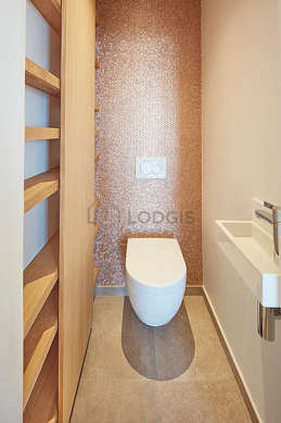 Cet appartement est équipé d'une salle de bain magnifique et très claire. Cette salle d'eau bénéficie du nécessaire pour votre bien-être au quotidien : baignoire, douche séparée, sèche cheveux, lave main, radiateur sèche-serviettes. Les toilettes sont séparées de la salle de bain et situées dans une pièce indépendante.
