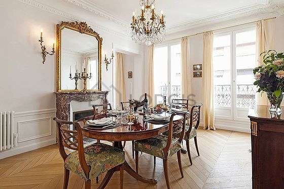 Afin de partager vos repas en toute convivialité pendant votre séjour parisien, ce duplex dispose d'une magnifique salle à manger qui peut accueillir jusqu'à 6 convives grâce à table à manger, buffet, vaisselle, cheminée, 1 chaise(s).