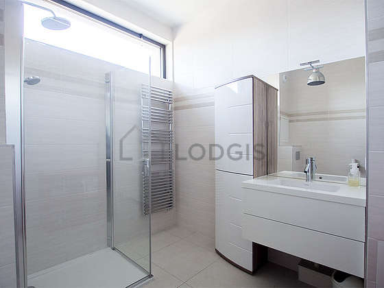Cet appartement est équipé d'une salle de bain magnifique et claire. Cette salle d'eau bénéficie du nécessaire pour votre bien-être au quotidien : etagère, placard, douche séparée, lavabo, radiateur sèche-serviettes. Les toilettes sont intégrées dans la salle de bain.