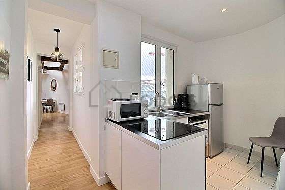Cet appartement dispose d'une magnifique cuisine avec du carrelage au sol et tout l'équipement indispensable pour votre quotidien : réfrigerateur, congélateur, micro ondes, freezer, vaisselle, 1 chaise(s), bar.