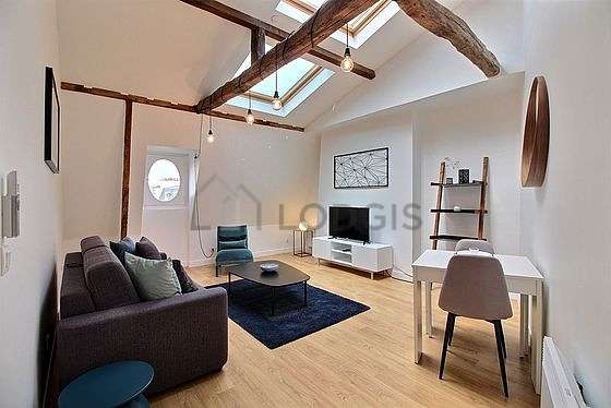 SéjourCet appartement est composé d'un beau salon avec du parquet au sol et des fenêtres. Ce salon très calme est meublé et équipé pour rendre votre séjour agréable : télé, canapé, 1 fauteuil(s), table à manger, table basse, etagère, commode, placard, 1 chaise(s).