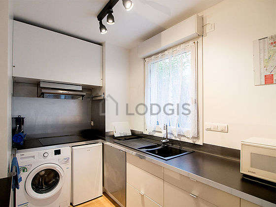 Cet appartement dispose d'une magnifique cuisine avec du parquet au sol et tout l'équipement indispensable pour votre quotidien : plaques de cuisson, réfrigerateur, micro ondes, hotte, etagère, placard, vaisselle, bar.