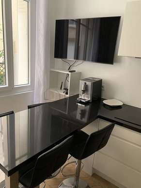 SéjourCet appartement est composé d'un magnifique salon avec du parquet au sol et des fenêtres et vue sur cour. Ce salon très calme est meublé et équipé pour rendre votre séjour agréable : télé, draps, couettes, canapé, 1 fauteuil(s), table à manger, bureau, penderie, etagère, armoire, commode, placard, vaisselle, 1 chaise(s).