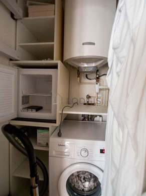 Cet appartement dispose d'une magnifique cuisine avec du parquet au sol et tout l'équipement nécessaire pour votre quotidien : plaques de cuisson, réfrigerateur, four, hotte, grille pain, cafetière, placard, vaisselle, poubelle.