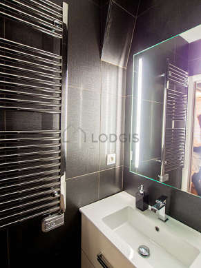Cet appartement est équipé d'une salle de bain magnifique avec des fenêtres double vitrage. Cette salle d'eau bénéficie du nécessaire pour votre bien-être au quotidien : commode, douche séparée, sèche cheveux, lavabo, miroir, radiateur sèche-serviettes, tapis. Les toilettes sont séparées de la salle de bain et situées dans une pièce indépendante.