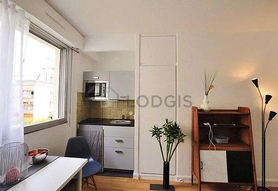Cet appartement dispose d'une magnifique cuisine avec du carrelage au sol et tout l'équipement essentiel pour votre quotidien : plaques de cuisson, réfrigerateur, micro ondes, placard, vaisselle.