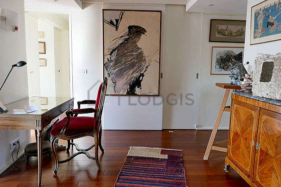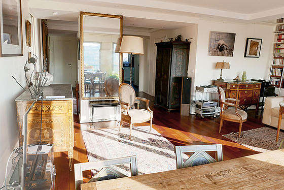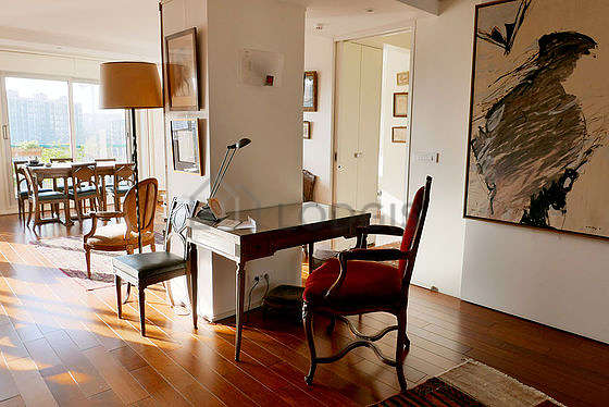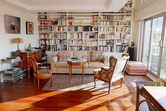 Cet appartement est composé d'un charmant salon avec du parquet au sol vue sur jardin. Ce salon très calme est meublé et équipé pour rendre votre séjour agréable : canapé, 1 fauteuil(s), table à manger, table basse, bibliothèque, commode, 1 chaise(s).