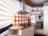 Cet appartement dispose d'une magnifique cuisine avec du parquet au sol et tout l'équipement nécessaire pour votre quotidien : plaques de cuisson, réfrigerateur, congélateur, four, micro ondes, hotte, bouilloire électrique, cafetière, table à manger, etagère, placard, vaisselle, bar.