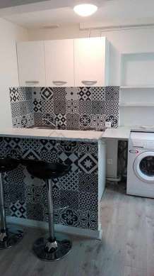 Cet appartement dispose d'une magnifique cuisine avec du parquet au sol et tout l'équipement essentiel pour votre quotidien : plaques de cuisson, réfrigerateur, vaisselle, tabouret, bar.