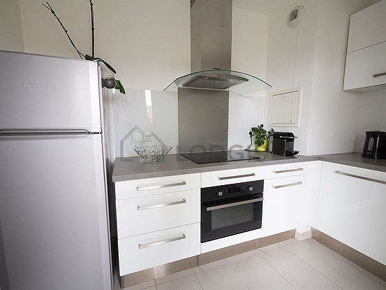 Cet appartement dispose d'une magnifique cuisine avec du carrelage au sol et tout l'équipement essentiel pour votre quotidien : plaques de cuisson, réfrigerateur, congélateur, micro onde combiné, hotte, bouilloire électrique, cafetière, placard, vaisselle, poubelle, ventilateur.