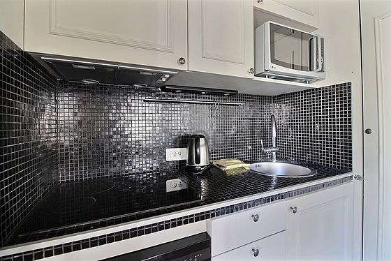 Cet appartement dispose d'une magnifique cuisine et tout l'équipement nécessaire pour votre quotidien : plaques de cuisson, réfrigerateur, congélateur, micro ondes, micro onde combiné, hotte, grille pain, cafetière, placard.