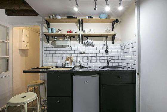 Cet appartement dispose d'une magnifique cuisine avec du parquet au sol et tout l'équipement essentiel pour votre quotidien : plaques de cuisson, réfrigerateur, micro ondes, bouilloire électrique, vaisselle, tabouret, bar.