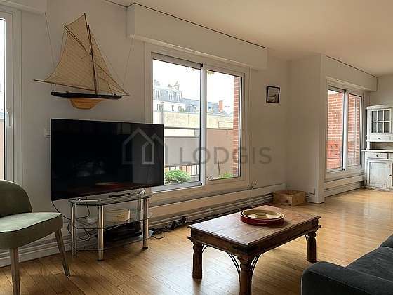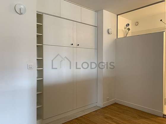 Cet appartement est composé d'un beau salon avec du parquet au sol et des fenêtres double vitrage. Ce salon très calme est meublé et équipé pour rendre votre séjour agréable : télé, canapé, bureau, bibliothèque, etagère, commode, placard, 1 chaise(s), lampadaire sur pied, meuble tv, miroir, tapis.