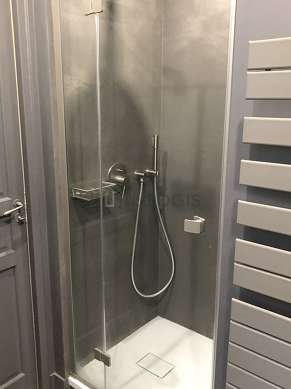 Cet appartement est équipé d'une salle de bain magnifique et très claire. Cette salle d'eau bénéficie du nécessaire pour votre bien-être au quotidien : serviettes de bain, penderie, placard, douche séparée, sèche cheveux, sanibroyeur, lavabo, lave main, radiateur sèche-serviettes. Les toilettes sont intégrées dans la salle de bain.