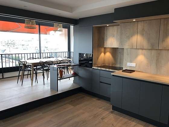 Ce duplex dispose d'une cuisine sur la salle a manger et tout l'équipement nécessaire pour votre quotidien : plaques de cuisson, réfrigerateur, congélateur, micro onde combiné, hotte, grille pain, cafetière, etagère, placard, vaisselle, 1 chaise(s), console, miroir, poubelle.