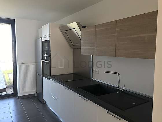 Cet appartement dispose d'une cuisine avec du carrelage au sol et tout l'équipement indispensable pour votre quotidien : plaques de cuisson, réfrigerateur, congélateur, four, micro ondes, hotte, grille pain, cafetière, table à manger, etagère, placard, vaisselle, tabouret, poubelle.
