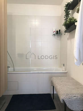 Cet appartement est équipé d'une salle de bain. Cette salle d'eau bénéficie du nécessaire pour votre bien-être au quotidien : serviettes de bain, etagère, placard, baignoire, 1 chaise(s), lavabo, lave main, miroir, porte serviettes, poubelle, radiateur sèche-serviettes, tapis, ventilateur. Les toilettes sont séparées de la salle de bain et situées dans une pièce indépendante.