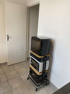 Cet appartement dispose d'une magnifique cuisine avec du carrelage au sol et tout l'équipement indispensable pour votre quotidien : plaques de cuisson, réfrigerateur, four, micro ondes, micro onde combiné, freezer, hotte, grille pain, cafetière, table à manger, etagère, placard, vaisselle, 1 chaise(s).