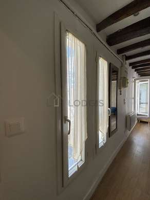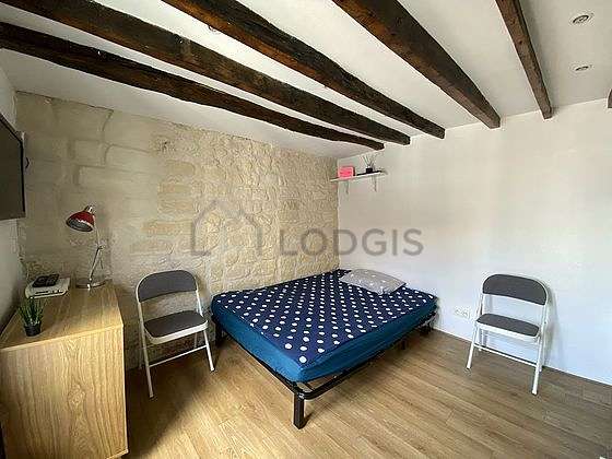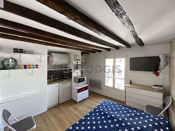 SéjourCet appartement est composé d'un charmant salon avec du parquet au sol et des fenêtres double vitrage. Ce salon calme est meublé et équipé pour rendre votre séjour agréable : télé, couettes, table à manger, etagère, commode, poutre, poubelle, vase1 canapé(s) lit(s) de 150cm.