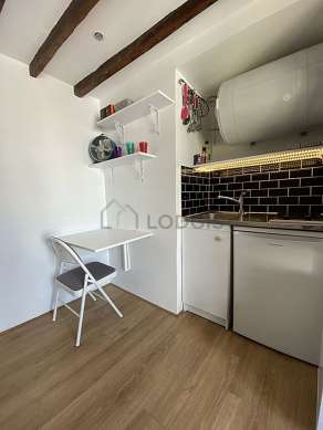 Cet appartement dispose d'une belle cuisine avec du carrelage au sol et tout l'équipement indispensable pour votre quotidien : plaques de cuisson, réfrigerateur, micro ondes, grille pain, etagère, vaisselle.