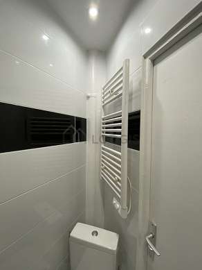 Cet appartement est équipé d'une salle de bain agréable et claire. Cette salle d'eau bénéficie du nécessaire pour votre bien-être au quotidien : serviettes de bain, etagère, placard, douche séparée, sèche cheveux, lavabo, radiateur sèche-serviettes. Les toilettes sont intégrées dans la salle de bain.
