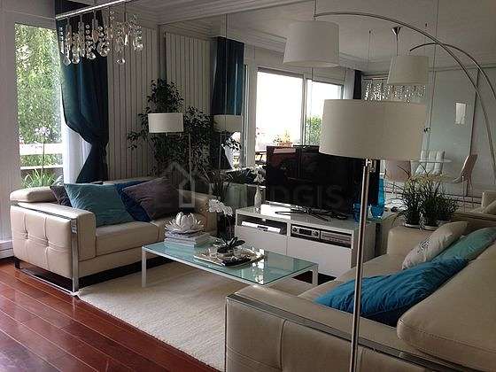 Cet appartement est composé d'un beau salon avec du parquet au sol et des fenêtres et vue sur jardin. Ce salon très calme est meublé et équipé pour rendre votre séjour agréable : télé, canapé, table à manger, penderie, placard, vaisselle, 1 chaise(s), meuble tv, miroir, tapis.