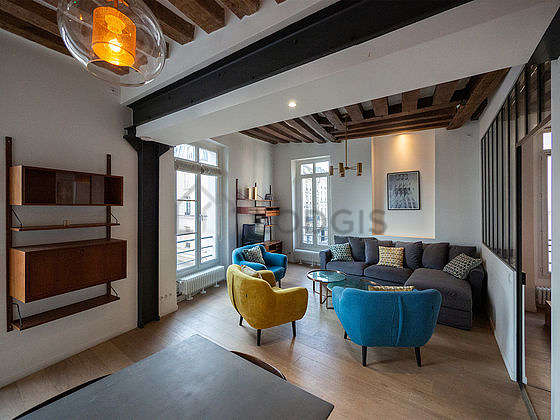 SéjourCet appartement est composé d'un superbe salon avec du parquet au sol vue sur rue. Ce salon calme est meublé et équipé pour rendre votre séjour agréable : télé, canapé, 1 fauteuil(s), table à manger, table basse, etagère, commode, poutre, 1 chaise(s).