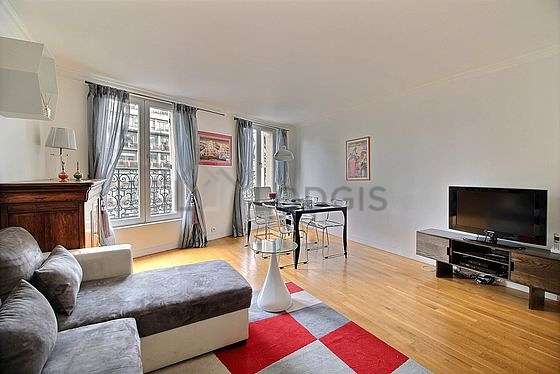 SéjourCet appartement est composé d'un beau salon avec du parquet au sol et des fenêtres. Ce salon très calme est meublé et équipé pour rendre votre séjour agréable : télé, canapé, 1 fauteuil(s), table à manger, etagère, 1 chaise(s).