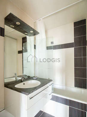 Cet appartement est équipé d'une salle de bain magnifique. Cette salle d'eau bénéficie du nécessaire pour votre bien-être au quotidien : etagère, placard, baignoire, lavabo. Les toilettes sont séparées de la salle de bain et situées dans une pièce indépendante.