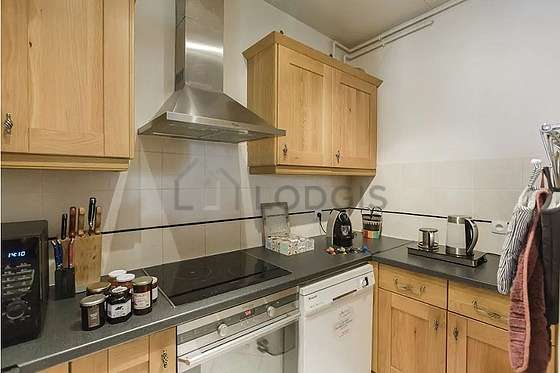 Cet appartement dispose d'une cuisine avec du carrelage au sol et tout l'équipement indispensable pour votre quotidien : plaques de cuisson, réfrigerateur, congélateur, four, micro ondes, hotte, grille pain, placard, vaisselle.