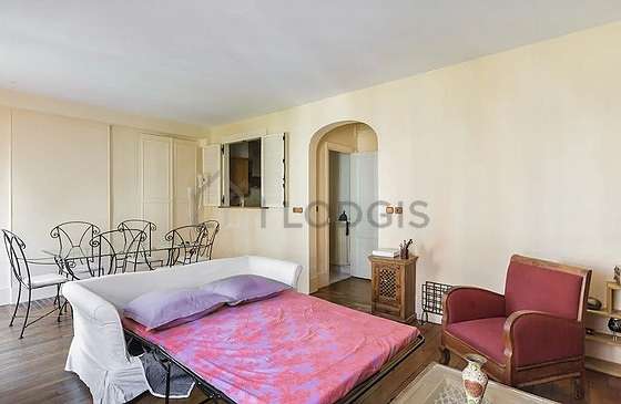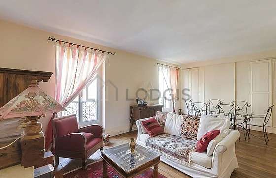 SéjourCet appartement est composé d'un salon avec du parquet au sol et des fenêtres. Ce salon est meublé et équipé pour rendre votre séjour agréable : canapé, 1 fauteuil(s), table à manger, table basse, placard, 1 chaise(s).