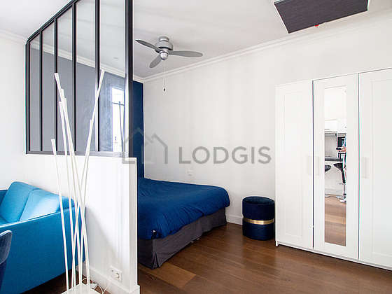 SéjourCet appartement est composé d'un beau salon avec du parquet au sol et des fenêtres et vue sur cour. Ce salon très calme est meublé et équipé pour rendre votre séjour agréable : télé, canapé, 1 fauteuil(s), table basse, etagère, placard, tabouret.