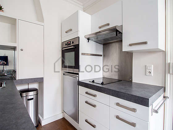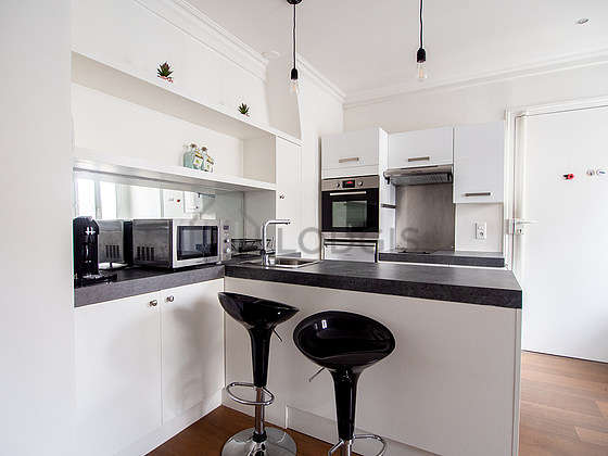 Cet appartement dispose d'une magnifique cuisine avec du parquet au sol et tout l'équipement nécessaire pour votre quotidien : plaques de cuisson, réfrigerateur, four, micro ondes, hotte, grille pain, bouilloire électrique, cafetière, etagère, placard, vaisselle, bar.