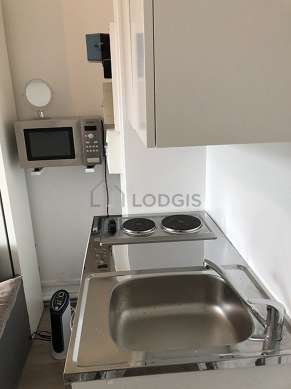 Cet appartement dispose d'une belle cuisine avec du parquet au sol et tout l'équipement nécessaire pour votre quotidien : plaques de cuisson, réfrigerateur, micro ondes, freezer, placard, vaisselle.