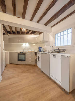 Cet appartement dispose d'une magnifique cuisine avec du parquet au sol et tout l'équipement indispensable pour votre quotidien : plaques de cuisson, réfrigerateur, congélateur, four, hotte, bouilloire électrique, cafetière, table à manger, etagère, armoire, placard, vaisselle, 1 chaise(s), poubelle.