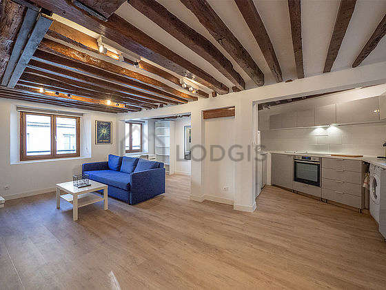 SéjourCet appartement est composé d'un superbe salon avec du parquet au sol vue sur rue. Ce salon très calme est meublé et équipé pour rendre votre séjour agréable : télé, canapé, table à manger, table basse, bureau, bibliothèque, placard, poutre, 1 chaise(s)1 canapé(s) lit(s) de 140cm.