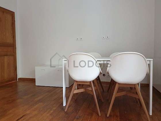 Cet appartement est composé d'un séduisant salon avec du parquet au sol et des fenêtres double vitrage et vue sur jardin. Ce salon très calme est meublé et équipé pour rendre votre séjour agréable : télé, canapé, 1 fauteuil(s), table à manger, 1 chaise(s), lampadaire sur pied, meuble tv, tableau.
