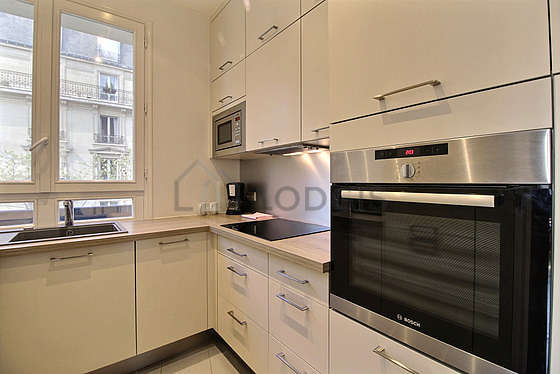 Cet appartement dispose d'une magnifique cuisine avec du carrelage au sol et tout l'équipement essentiel pour votre quotidien : plaques de cuisson, réfrigerateur, four, hotte, grille pain, bouilloire électrique, cafetière, etagère, placard, vaisselle.