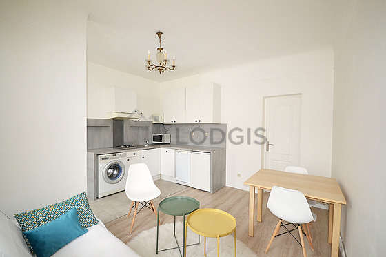 Cet appartement dispose d'une cuisine sur le séjour avec du parquet au sol et tout l'équipement nécessaire pour votre quotidien : plaques de cuisson, réfrigerateur, congélateur, four, micro ondes, hotte, table à manger, etagère, placard, vaisselle, 1 chaise(s).