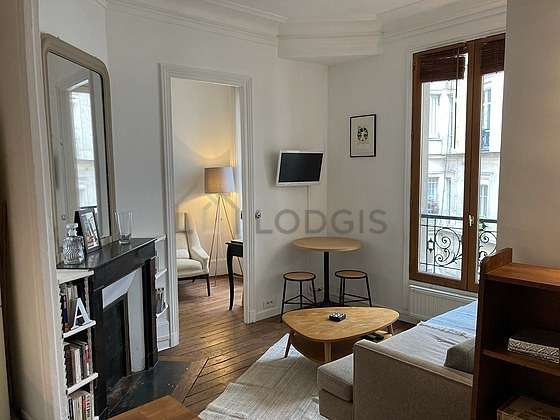 SéjourCet appartement est composé d'un beau salon avec du parquet au sol et des fenêtres double vitrage. Ce salon très calme est meublé et équipé pour rendre votre séjour agréable : télé, canapé, table à manger, table basse, bibliothèque, cheminée, 1 chaise(s), lampadaire sur pied, miroir, tableau.