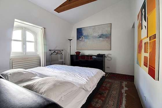 Avec du parquet au sol et des fenêtres cette chambre splendide offre l'équipement nécessaire pour vous reposer pendant votre séjour : draps, couettes, bureau, placard, console, tableau, tapis1 lit(s) de 180cm.