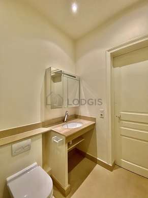 Cet appartement est équipé d'une salle de bain magnifique et claire. Cette salle d'eau bénéficie du nécessaire pour votre bien-être au quotidien : serviettes de bain, placard, douche séparée, lavabo, radiateur sèche-serviettes. Les toilettes sont séparées de la salle de bain et situées dans une pièce indépendante.