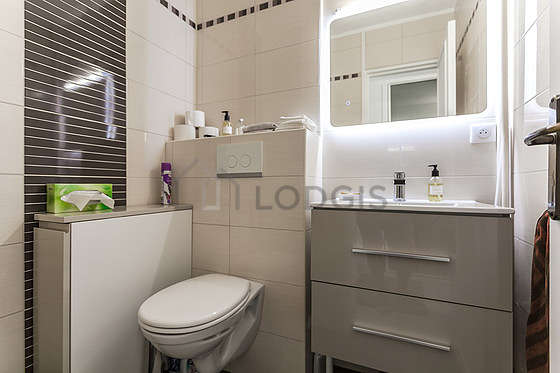Cet appartement est équipé d'une salle de bain magnifique et claire. Cette salle d'eau bénéficie du nécessaire pour votre bien-être au quotidien : serviettes de bain, commode, placard, douche séparée, sèche cheveux, sanibroyeur, lavabo, miroir, poubelle, tapis. Les toilettes sont intégrées dans la salle de bain.