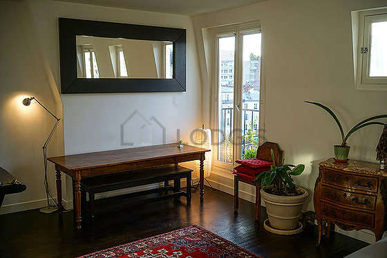 SéjourCet appartement est composé d'un magnifique salon avec du parquet au sol et des fenêtres double vitrage. Ce salon très calme est meublé et équipé pour rendre votre séjour agréable : télé, draps, couettes, canapé, table à manger, bureau, commode, cheminée, 1 chaise(s), miroir, tapis.