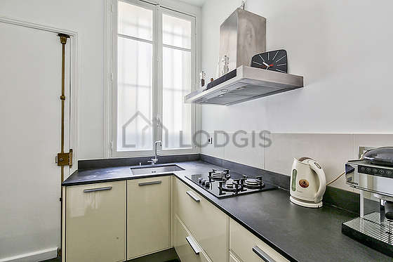 Cet appartement dispose d'une magnifique cuisine avec du carrelage au sol et tout l'équipement indispensable pour votre quotidien : plaques de cuisson, réfrigerateur, congélateur, four, micro ondes, hotte, grille pain, bouilloire électrique, cafetière, etagère, placard, vaisselle.