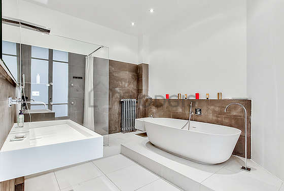Cet appartement est équipé d'une salle de bain magnifique et très claire avec des fenêtres. Cette salle d'eau bénéficie du nécessaire pour votre bien-être au quotidien : serviettes de bain, baignoire, douche séparée, lavabo. Les toilettes sont séparées de la salle de bain et situées dans une pièce indépendante.