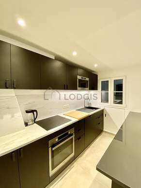 Cet appartement dispose d'une magnifique cuisine avec du carrelage au sol et tout l'équipement indispensable pour votre quotidien : plaques de cuisson, réfrigerateur, congélateur, four, hotte, grille pain, bouilloire électrique, cafetière, placard, vaisselle, tabouret, bar.