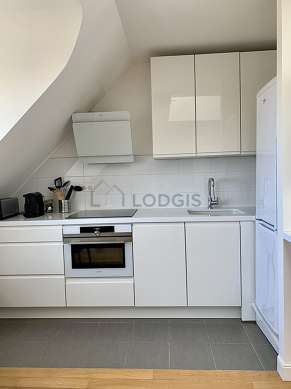 Cet appartement dispose d'une magnifique cuisine avec du carrelage au sol et tout l'équipement nécessaire pour votre quotidien : plaques de cuisson, réfrigerateur, congélateur, four, micro onde combiné, hotte, grille pain, bouilloire électrique, cafetière, table à manger, placard, vaisselle, mixeur / robot, poubelle.