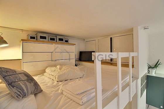 Grâce à une belle hauteur sous plafond, une mezzanine a pu être installée dans cet appartement , vous offrant ainsi une vraie pièce supplémentaire équipée de draps, couettes, etagère, placard.
