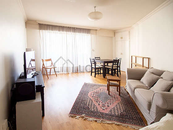 SéjourCet appartement est composé d'un plaisant salon avec du parquet au sol et des fenêtres avec balcon. Ce salon très calme est meublé et équipé pour rendre votre séjour agréable : télé, canapé, table à manger, table basse, etagère, placard, 5 chaise(s), table de chevet, meuble tv, tapis.